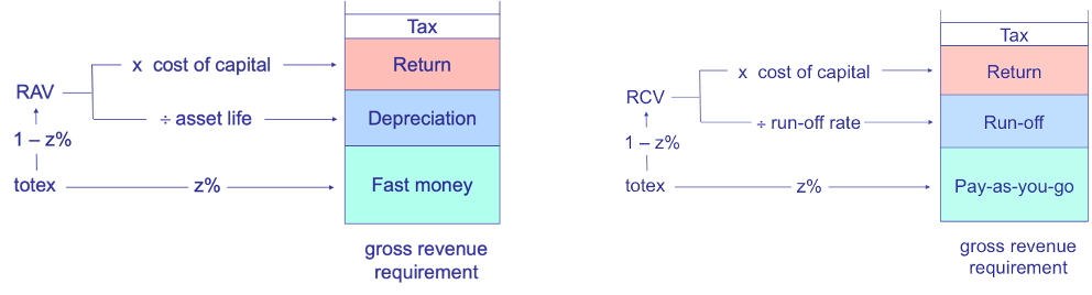 Note that the last of these innovations required Ofgem and Ofwat to find different labels for their price control building blocks. The green building block in my diagram was now to be called ‘fast money’ or ‘pay-as-you-go’ (PAYG). Ofwat also decided that it would be helpful to replace the term depreciation with the more all-embracing label ‘RCV run-off’.